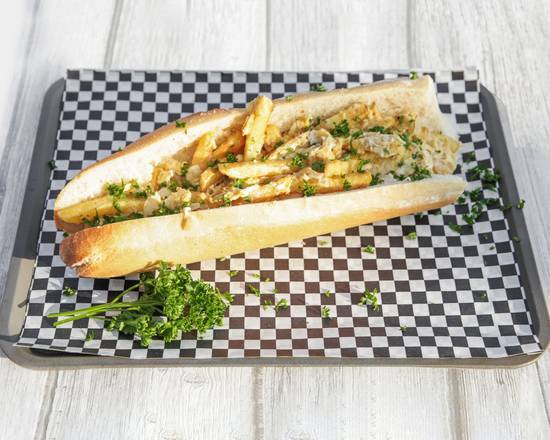 Sandwich baguette frites mélangées avec des œuf plein air oignons cuit dans un beurre maître de hôtel.