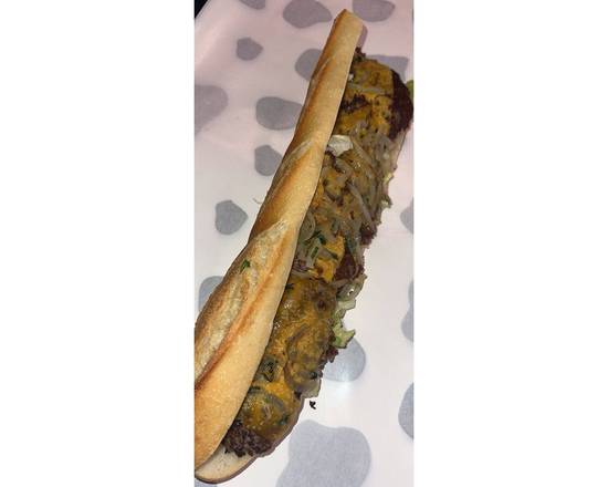 Sandwich 1/2 baguette steak haché frais smasher 200g,cheddar anglais x2,salade,oignons.